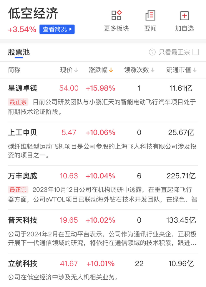 低开经济概念股持续活跃,立航科技6连板、万丰奥威、上工申贝等个股涨停,中信海直、金盾股份、四创电子、香山股份等个股涨幅居前。消息面上,记者从安徽省通航飞行服务站了解到,该站协助省通航协调管理服务中心提报的《2024年度安徽省低空空域航线划设方案》顺利获批,低空航线较去年新增3条。