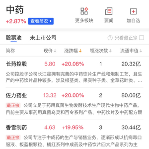 板块上,中药板块今日涨幅居前,佐力药业、长药控股、香雪制药大涨20%,维康药业、大理药业、龙津药业、佛慈制药等个股涨幅居前。