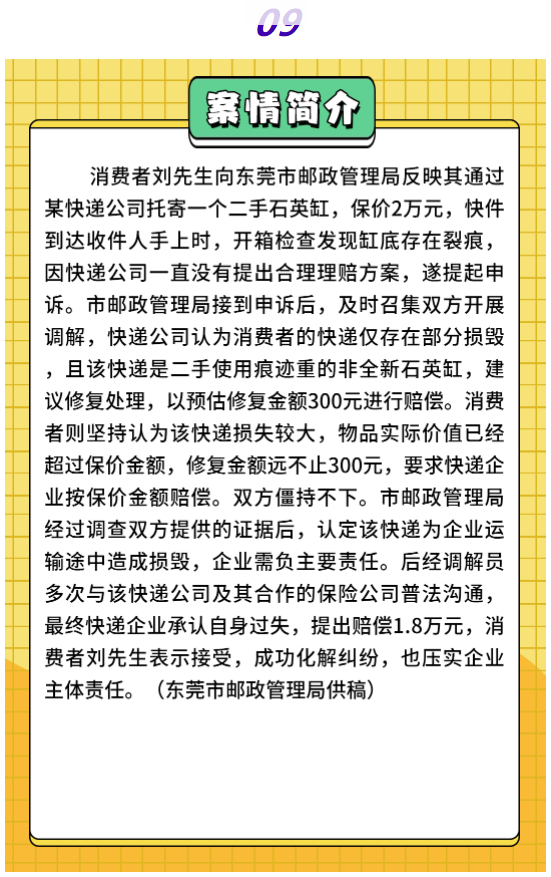 建议消费者在寄出快递前,仔细阅读快递企业的格式条款(纸质面单背面、手机APP或小程序界面的电子运单服务协议),知悉双方约定情况,了解自身权益,对于贵重物品,一定要进行保价,妥善保管交寄及付款凭证、保存好寄递物品的价值凭证。遇到问题时可先与快递企业进行沟通,若沟通无果,应及时向有关部门反映,通过合法途径维护自己的权利。快递企业要切实提升寄递服务质量,安全、准时送达托寄物品。发生快件延误、丢失、损毁等问题时,要及时妥善处理用户的诉求,充分保障消费者的合法权益。