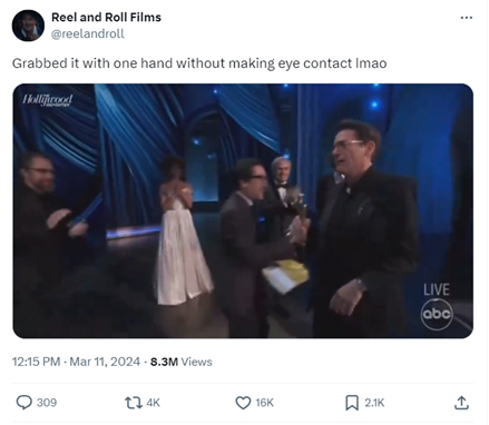 墨菲凭借电影《奥本海默》获得奥斯卡最佳男主角奖,在登台后,他和每一位在台上的人一一握手致意,随后从颁奖者手中接过奖杯,他的这一做法赢得了广大网友的点赞。