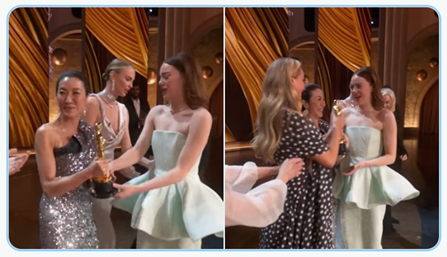 颁奖播出后,有网友发视频指出,艾玛在接受颁奖时,既没有直接从杨紫琼手中接过奖杯,也没有向其致谢,反而一直和自己的好友、美国电影明星詹妮弗·劳伦斯交流,甚至是从詹妮弗手中接过奖杯。
