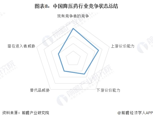 从波特五力模型角度分析,由于我国降压药行业现有竞争者数量较多且国内本土企业要从外资原研企业手中争夺市场份额,故现有竞争者竞争较为激烈。同时,虽然行业利润较高,但技术门槛也较高,故行业新进入者威胁不是很大。由于降压药行业中,上游也为技术密集型产业,因此,上游供应商议价能力较强。降压药行业本身也是技术密集型行业,且其需求存在刚性,故下游议价能力弱。替代品威胁方面,降压药在高血压治疗领域难以替代,故替代品威胁小。