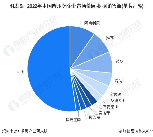 从降压药行业企业市场份额占比情况来看,2022年,阿斯利康、拜耳、诺华和辉瑞四家外资企业市场份额占比最高,占比分别约9.7%、8.8%、8.1%和5.0%。其余企业市场份额占比均在5%以下。