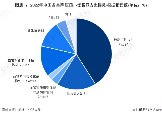 从七大类临床推荐常用降压药市场份额占比来看,2022年,我国钙离子拮抗剂(CCB)市场份额占比最高,占比近41%,其次是单片复方制剂,占比近18%。