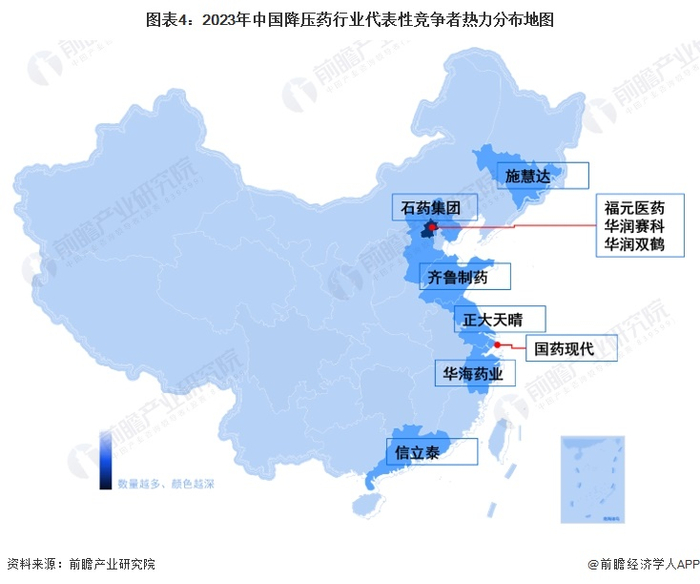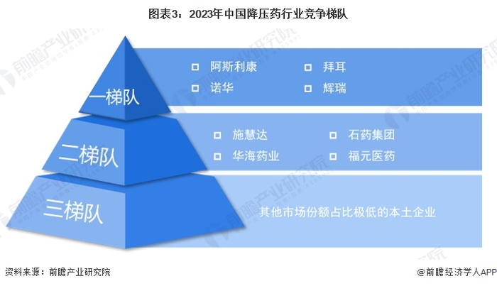 从我国降压药行业竞争梯队来看,阿斯利康、拜耳、诺华和辉瑞等外资企业为原研药品厂商,进入市场早,患者依从性相对较高,占据主要市场份额,处于第一梯队;施慧达、华海药业、石药集团、福元医药本土企业已经在细分产品领域形成一定竞争力,占据了一定市场份额,处于第二梯队;其余占据市场份额极小的本土企业处于第三梯队。