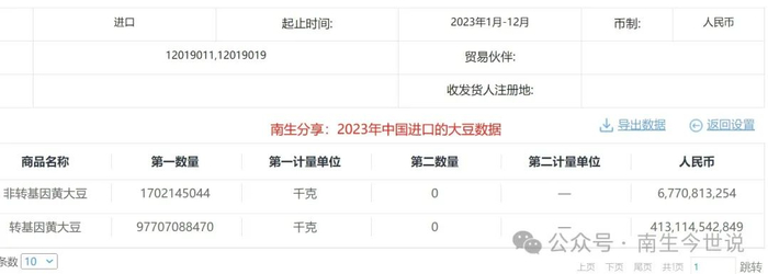 接着看2023年,还是源自我国海关总署公开的消息:进口的非转基因大豆数量约为170.21万吨,进口金额为67.71亿元(如下图),平均每吨大豆售价在3978元人民币。
