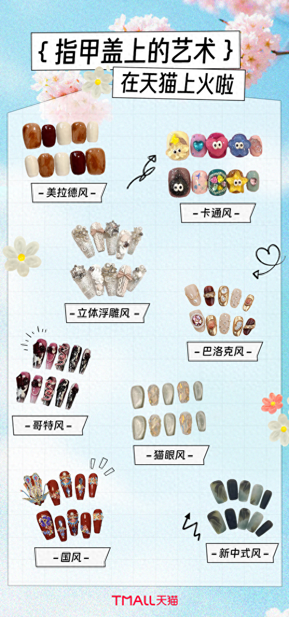 从烟花美甲、新中式风、新年晕染风、猫眼爆闪风,到更适合春天的裸色、巴洛克风、哥特风、可爱风、美拉德风……女生们纷纷变身美甲师,为自己美甲。数据显示,三月以来,天猫上穿戴甲的销量同比增涨达200%,且有持续见涨的趋势。