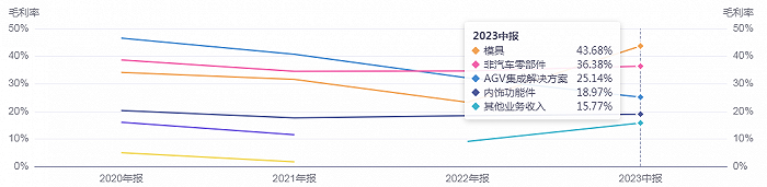 截至2023年上半,汽车内饰功能件、模具和AGV机器人三大类产品占公司总营收比例分别为80.63%、5.78%和3.19%。从毛利率角度看,模具产品毛利率达43.68%,内饰功能件产品毛利率仅为18.97%。