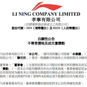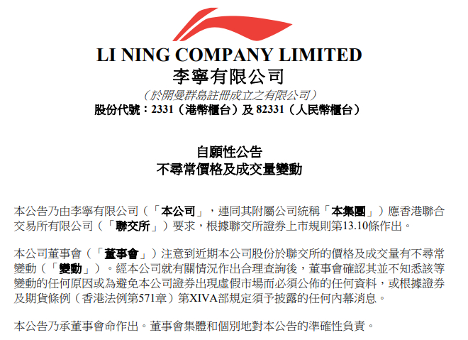 3月12日盘后,李宁在港交所发布公告称,董事会注意到近期公司股份于港交所的价格及成交量有不寻常变动。经公司就有关情况作出合理查询后,董事会确认其并不知悉该等变动的任何原因或为避免公司证券出现虚假市场而必须公布的任何资料,或根据证券及期货条例(香港法例第571章)第XIVA部规定须予披露的任何内幕消息。