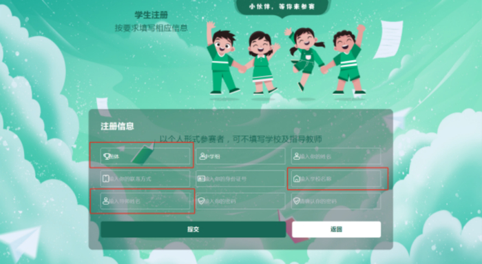 点击“学生注册”,参赛方式选择“个人”,填写组别、姓名、身份证号、联系方式和密码后提交,个人注册无需审核直接通过。