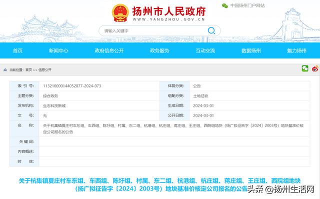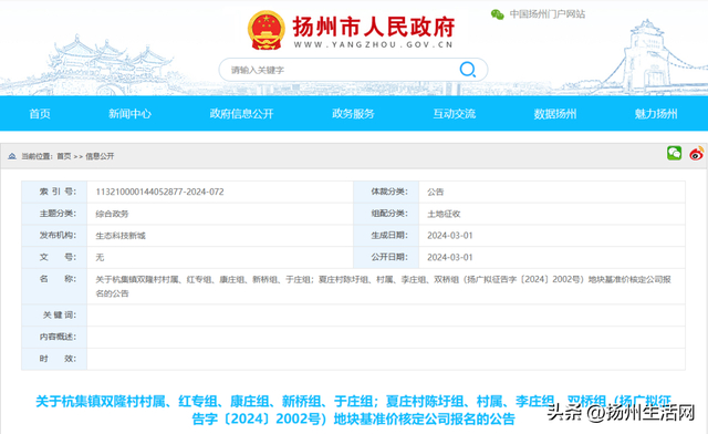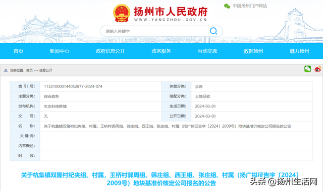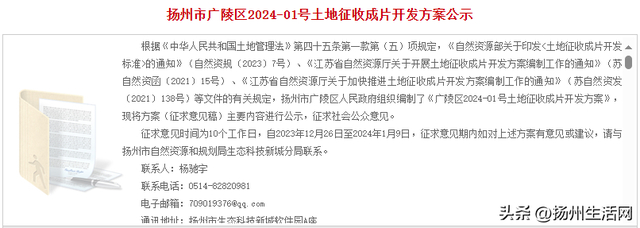 日前,扬州市广陵区人民政府发布了“2024-01号土地征收成片开发方案公示”。