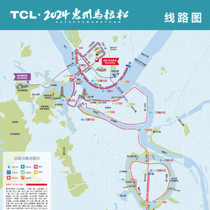 1.全程马拉松(42.195KM):云山西路(出发点)→文明一路→三新南路→文昌二路→东江一路→东江二路→东江三路(折返)→东江二路→东江一路→文昌二路→惠州大桥→环城西路→塘尾街→水门路→中山南路→中山东路→东新桥→新民后街→下塘街→滨江东路→环岛二路→环岛一路→东湖路→永平路→新建路→水门大桥→惠沙堤一路→惠沙堤二路→金山大道→金山大道辅道→瞰湖三路→湖畔南路→瞰湖一路→瞰湖二路→金山大道辅道→金山大道(折返)→惠州奥林匹克体育场(终点)。