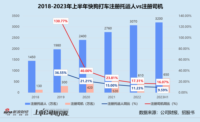 吸引用户的奖励补贴和广告投放力度大不如前,对平台流量的负面影响难以回避。2023年上半年,快狗打车的注册托运人约为3200万名,较2022年末增长130万名。注册司机约为650万名,只比2022年末增加了40万名,同比增速更是双双创下近4年半以来的最低点。在平台完成的运托订单数量和交易总额分别为1210万单、11.79亿元,与2022年上半年同指标基本持平。