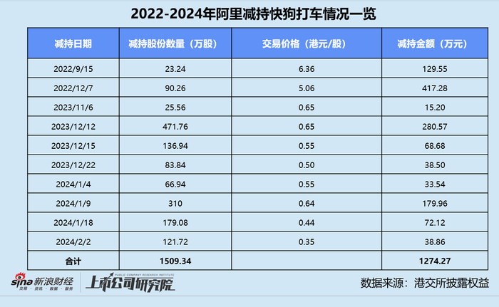 事实上,如此频繁的减持行为并非第一次。早在2022年快狗打车上市后不到6个月,阿里便以“骨折”价先后售出了23.24万股、90.26万股,减持金额累计达604.76万元。2023年11月6日至12月22日期间,阿里及相关实体又接连通过4轮减持共计交易718.19万股,减持总金额约为442.57万元。