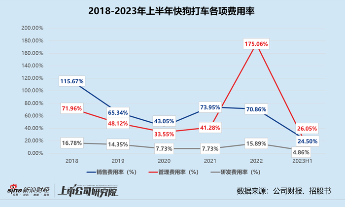 为了扭转持续亏损的局面,快狗打车尝试大幅缩减开支。2023年前6个月,公司的销售及营销费用约为1.11亿元,同比下降33.93%,销售费用率从2022年的70.86%降至24.50%;一般及行政费用率约为1.18亿元,同比缩水81.73%,管理费用率较2022年骤降近150个百分点;研发费用同步“腰斩”,费用率还不足5%。