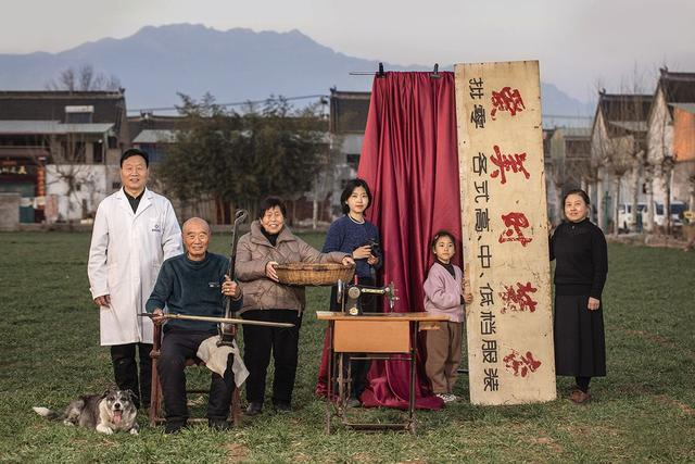 2月12日,河南省济源市屈西村,一家7口(包括狗)正在拍摄。照片中的招牌是他们30年前开设裁缝店留下的,母亲(右一)目前在村里开了鞋类加工厂。爷爷(右五)是村豫剧队的二胡手,同时也是村里的风水先生。爷爷和奶奶常常搭配,奶奶唱豫剧,爷爷拉二胡。