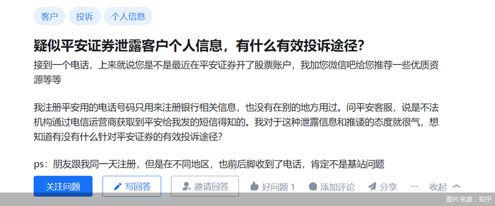 “开户后多次收到骚扰电话,是信息泄露、诈骗还是信息被盗用?”有投资者在小红书发出上述质疑,也有投资者在知乎社交平台吐槽,疑似券商App泄露客户个人信息,开户后频繁收到推荐资源的短信。亦有投资者在评论区表达赞同,他表示,自己只用过某券商App,但此后频繁被人打电话推荐股票。北京商报记者关注到,种种关于券商App获取、泄露客户信息的吐槽从未停歇。