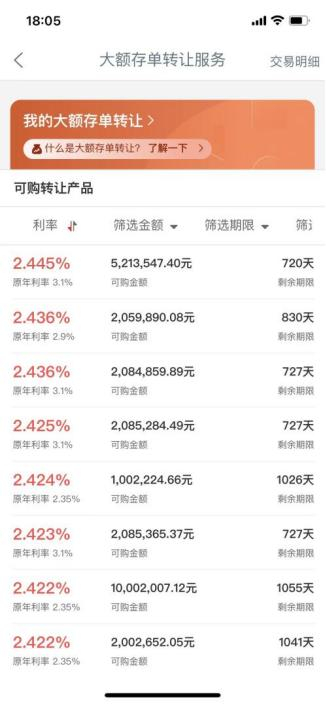 3月11日,红星新闻记者分别登录了工商银行、建设银行、民生银行等多家银行的手机银行App,发现每家银行都有几十款大额存单处于转让中。多数产品的剩余期限集中在逾1000天,利率为2.40%~2.60%,同期限产品股份制银行利率略高于国有银行。