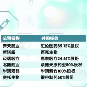 仅在A股市场,就涌现出新天药业收购汇伦医药、华润双鹤收购华润紫竹、中国通用集团并购整合重药控股、迈瑞医疗收购惠泰医疗等大型交易案例,还有北陆药业、赛托生物、新诺威等一批上市公司抛出交易方案,并购市场迎来一轮小高潮。