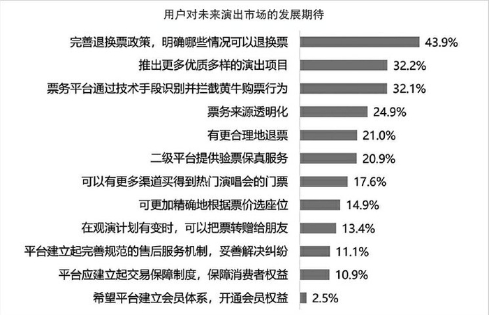 《报告》显示,消费者对未来演出市场最大的期待,一是有更加完善的退改方案,二是有更多优质的、多元的演出项目。