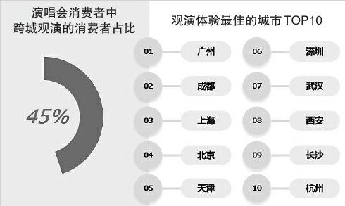 跨城看演出成为消费新现象,现场观看演出的消费者中,跨城观演的消费者占比为45%。消费者满意度最高的十大演出城市分别是:广州、成都、上海、北京、天津、深圳、武汉、西安、长沙、杭州。