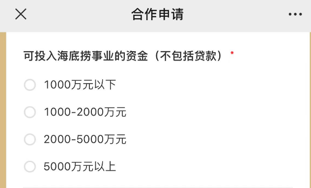 海底捞在加盟申请表中,也对加盟商的财务实力划分了几个档位,除去贷款,能够投入海底捞事业的最低资金门槛是1000万及以下。