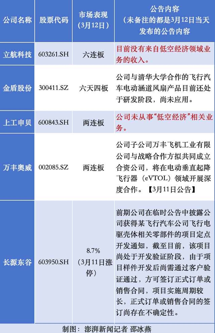 12日晚,立航科技、金盾股份、上工申贝和长源东谷(603950.SH)四家上市公司因股价异动,立航科技和上工申贝均在公告中澄清,前者称目前没有来自低空经济领域业务收入,后者称公司未从事“低空经济”相关业务。金盾股份和长源东谷则在公告中表示,相关飞行汽车产品业务尚处于研发验证阶段。