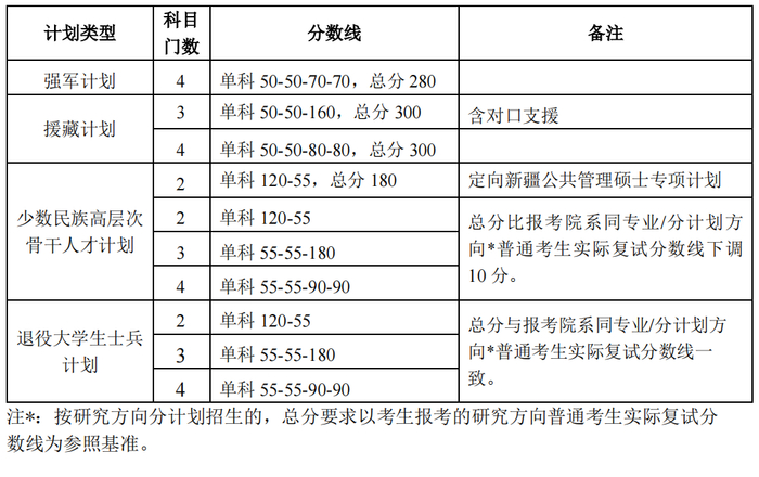 (2)“少数民族高层次骨干人才计划”(不含新疆MPA项目):按照所报考院系(专业/研究方向)的复试分数线,总分线降10分,单科线不降。