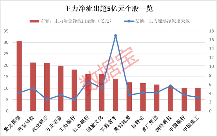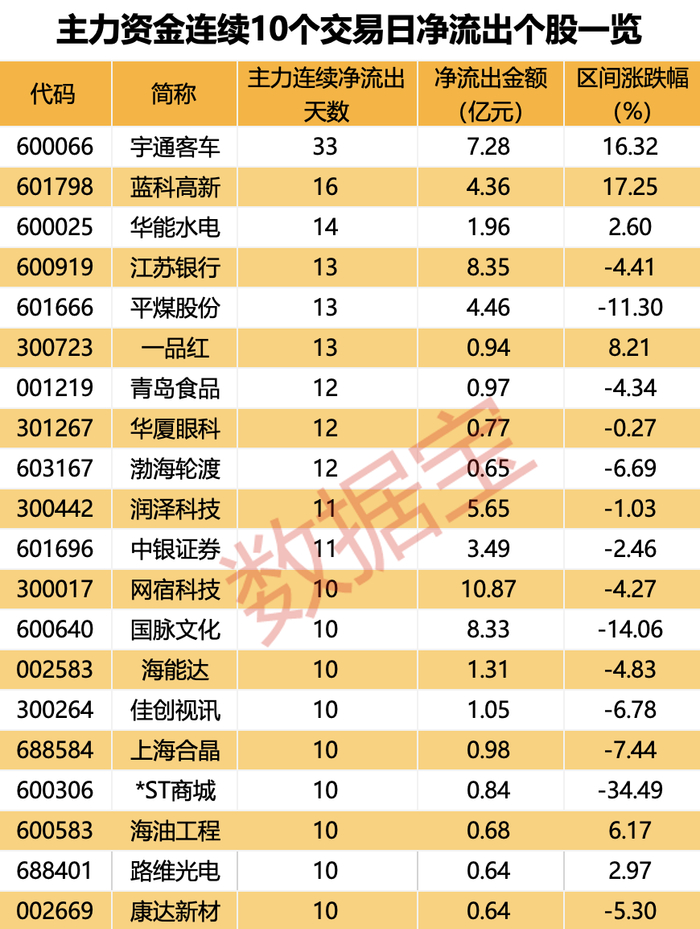 从净流出持续天数来看,宇通客车连续33个交易日主力资金净流出,合计净流出7.28亿元,其间股价累计上涨16.32%,主力净流出额占成交金额的5.77%。蓝科高新连续16日主力资金净流出,合计净流出4.36亿元。