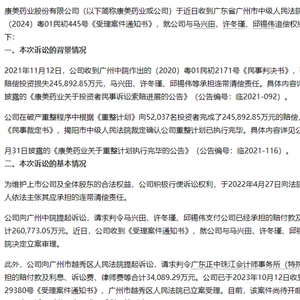 ST康美昨日同时公告,全资子公司康美中药城(普宁)有限公司(简称“普宁中药城”)的债权人佛山市翔盈家具制造有限公司以普宁中药城无法清偿到期债务为由,向广东省揭阳市中级法院申请其破产清算。截至目前,公司尚未收到揭阳中院关于普宁中药城被申请破产清算的裁定,普宁中药城是否进入破产清算程序尚存在重大不确定性。普宁中药城拟向揭阳中院提交《破产申请异议书》并附相关证据资料。