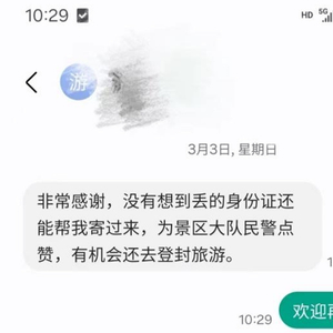 “非常感谢,没想到丢失的身份证还能帮我寄回来,为景区大队民警点赞。”2024年3月初,登封市公安局景区治安管理大队指导员殷少磊,陆续收到了苏州游客张先生、洛阳游客朱先生发来的感谢短信。