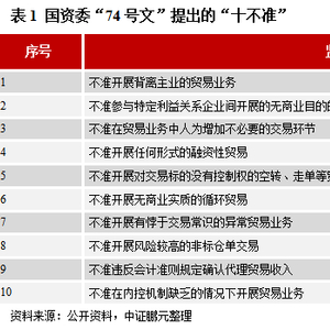除了继续做大来自于上述三类项目的收入外,还可以通过新增或扩大以下几类收入来实现总收入中城投类占比低于30%:(1)房地产销售收入,主要是商品住宅销售收入;(2)资产租赁收入,包括商铺、写字楼、厂房等的租金;(3)景区门票收入,需提醒的是应避免相关收入归集后上缴地方财政然后再返还给当地城投,否则很可能被认定为财政性现金流;(4)工程施工收入,有别于传统城建业务中的工程代建,是城投公司在具备专业资质的基础上,凭借专业能力获取的市场化业务收入;(5)贸易收入,此类业务能在较短时间内增大城投公司的营业收入、改变城投公司的收入结构,已经成为很多城投公司优化报表的“法宝”,加之监管部门目前不仅将其认定为经营性收入,而且并未对其作剔除处理(实践中有评级机构将城投公司的贸易收入从营业收入中剔除,理由是认为该部分业务只是表面上改善了营业收入的数据,但实际上对利润的贡献很小甚至为负),故各家城投还是可以保持合理的贸易业务规模,只是要注意开展业务的过程中一定避免合规风险。去年12月国资委发布《关于规范中央企业贸易管理严禁各类虚假贸易的通知》(简称“74号文”),针对国企央企开展贸易业务明确提出了“十不准”(见表1),这提醒城投公司一定要确保贸易背景的真实性,不得出于维持自身信用评级、获取外部融资等目的而“无中生有”、“虚假做大”,同时要建立完善的贸易业务内控体系,平衡好安全与发展的关系,此外还应避免开展非标仓单交易等超出自身专业能力范围的高风险业务品类。除了以上五类收入,城投公司还可以通过收购上市公司股权、划入产业类企业(不限于当地国企,还可以考虑民企)股权、整合类金融机构(如小贷、融资租赁、融资担保等)股权等方式来进一步丰富经营性收入类型、扩大经营性收入规模,这些操作见效确实快但蕴含着不同程度的风险,可行性也会受各种客观条件的限制,城投公司在具体实施相关方案时应保持谨慎、思虑周全,此处不再详述。