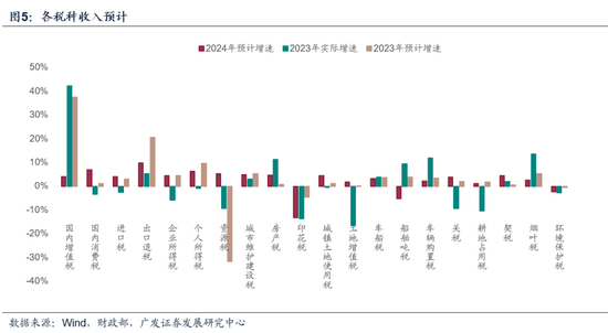 从分项指标变化情况来看,也的确如此。预算报告预计2024年国内增值税占比38.5%,虽较去年的38.3%小幅上升,但其对应的收入增速为4.1%,较去年明显偏低;印花税预计占比1.7%,显著低于去年的2.1%,对应增速-13.3%;出口退税对应增速9.9%,为所有税种分项中预期增速之首,一定程度上反映了对今年外贸出口的良好预期,但出口退税是财政收入的下拉力(图)。