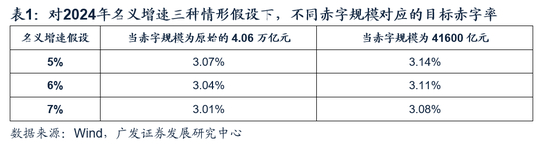 基于此我们进一步测算,若2024年名义经济增速分别录得5%、6%、7%,且目标赤字规模仍保持4.06万亿元不变,则所对应的目标赤字率为3.07%、3.04%、3.01%(表)。