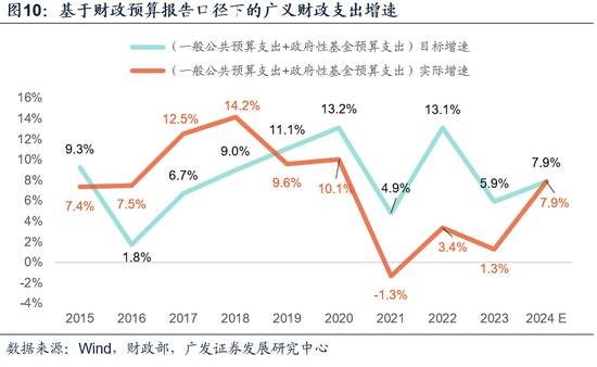 预算报告中,2024年一般公共预算收入规模预计22.40万亿元,增速3.3%;对应的支出规模预计28.55万亿元,增速4%(含5000亿元增发国债结转)。2024年政府性基金收入规模预计7.08万亿元,增速0.1%;支出规模预计12.02万亿元,增速18.6%(含1万亿元超长期特别国债)。因此,根据预算报告显示,两本账合并后的广义财政支出增速为7.9%,高于去年的1.3%和3.4%(图)。