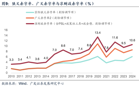 基于考虑传统赤字、调节项、专项债、2020年抗疫特别国债、2023年增发国债、2024年超长期建设国债、2022年政策性开发性金融工具、2015-2017年共计15000亿元的专项建设基金、PSL、政金债等多项广义财政资金综合考虑,我们可进一步测算准财政赤字率。需要注意,尽管政策性开发性金融工具于2022年落地,但其实际影响延续至2023年前三季度[2]。