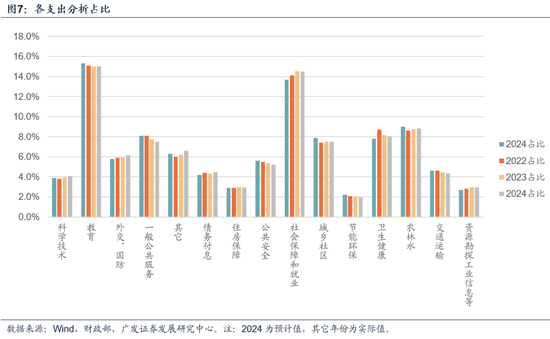 2024年预算报告中,各支出分项占比分别为(图):科技4.0%(提升0.1个百分点)、教育15.0%(基本持平)、外交国防6.1%(提升0.18个百分点)、一般公共服务7.5%(下降0.25个百分点)、文化旅游体育与传媒、灾害防治及应急管理等其他6.6%(提升0.35个百分点)、债务付息4.5%(提升0.16个百分点)、住房保障2.9%(基本持平)、公共安全5.2%(下降0.19个百分点)、社保就业14.5%(基本持平)、城乡社区7.5%(基本持平)、节能环保2.0%(下降0.1个百分点)、卫生健康8.0%(下降0.16个百分点)、农林水事务8.8%(提升0.12个百分点)、交通运输4.4%(下降0.08个百分点)、资源勘探工业信息等2.9%(下降0.07个百分点)。