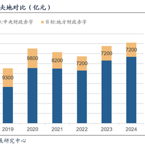 这一安排符合预期,近年来由于地方债务压力增加,中央赤字规模占比逐年提高,自2018年的65%,逐步上升至今年的82%(图)。此外,自2022年地方赤字规模收缩至7200亿元后,今年已是地方赤字规模保持不变的第三年。