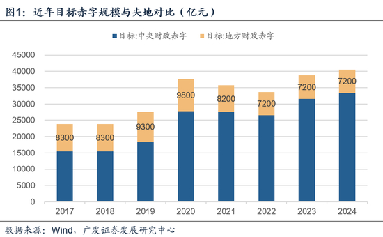因此若“赤字率=赤字规模/名义GDP”分母端名义GDP增速与市场基准预期保持一致,目标赤字率可能上升至3.1%左右。但0.1个点的增幅影响较小,因此维持在3.0%红线再叠加广义财政(超长期建设国债等)是较为合意的选择。