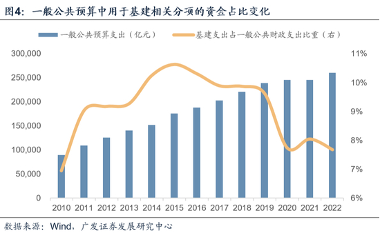 近年,财政第一本账一般公共预算、财政第二本账政府性基金预算角色分工进一步分化,第一本账支出更倾向于民生领域,第二本账中专项债对基建项目的支持力度有所增大。因此,近年来一般公共预算中基建相关支出占比由2015年的10.6%逐渐下行至7.7%(图)。