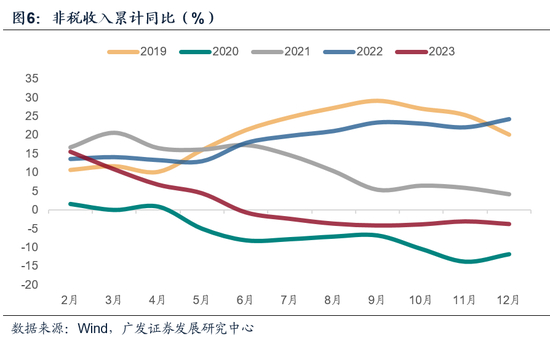 此外自2019年起,非税收入一直保持着较高的增速水平(图),非税收入的高增主要依赖地方多渠道盘活闲置资产,带动国有资源(资产)有偿使用收入增长(2022年还有特定国有金融机构和专营机构上缴利润入库、原油价格上涨带动石油特别收益金专项收入增加、矿产资源有关的收入增加等因素),但长期维持这一水平的难度较高,这或许也是2024年一般公共预算收入增速较低的原因之一。