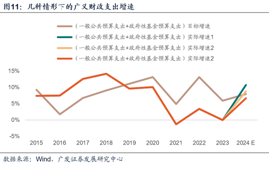 三是在实际操作中,政府性基金预算支出还包含了一部分调入一般公共预算的部分,这会造成两本账支出的重复计算。若2024年政府性基金收入调入一般公共预算收入的规模为8000亿元,则基于这一假设得到广义财政支出增速为6.6%,当然这一增速亦仍然显著高于去年的-0.1%。