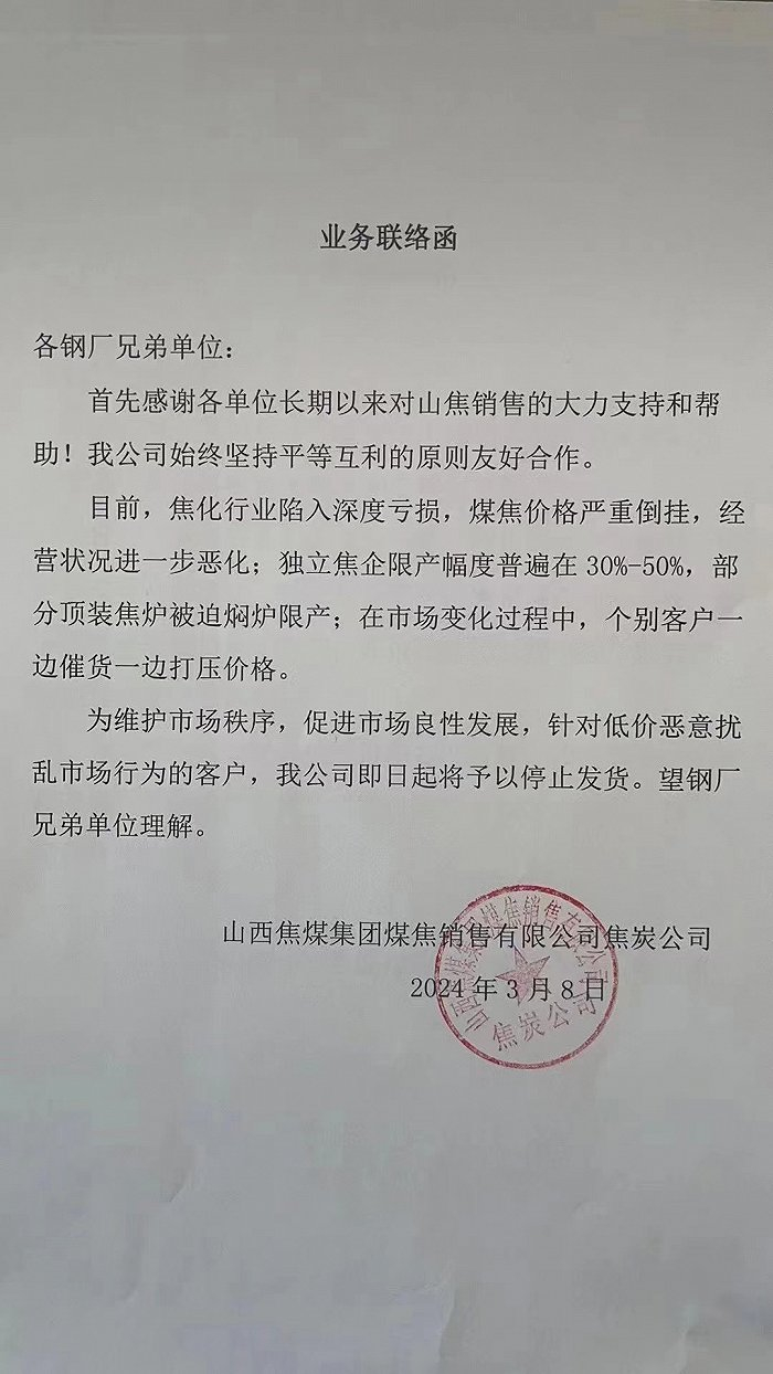界面新闻记者获悉,早在3月8日,山西焦煤集团煤焦销售有限公司焦炭公司(下称山西焦煤焦炭公司)、山西梗阳新能源有限公司(下称山西梗阳)出业务联络函,抵制钢厂焦炭采购降价。
