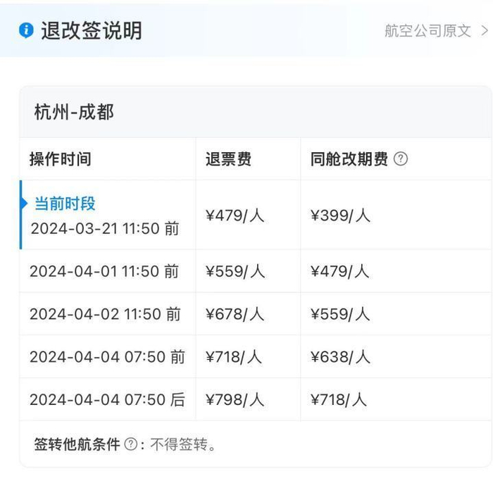以2024年清明假期4月4日当天杭州直飞成都天府机场的两个航班为例,票面价均为798元,天津航空GS6507(11:20-14:20)航班退改费用160元起,首都航空JD5259(11:50-15:20)航班退改费用399元起。