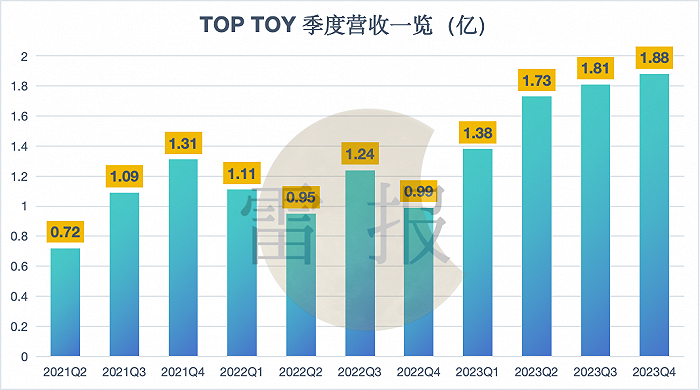 结合其过往业绩报告,我们可以知道,2023年Q1-Q4四个季度,TOP TOY品牌的收入分别为1.38、1.73、1.81、以及1.88亿人民币。