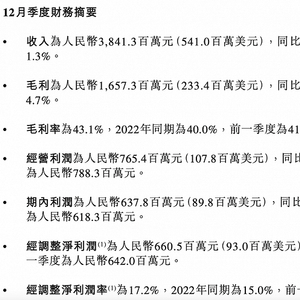 而其经调整净利润为6.61亿,同比增长77%,前一季度为人民币6.42亿;2023年全年,名创优品的总营收突破138亿,同比增长近40%,调整后净利润约23.6亿元。