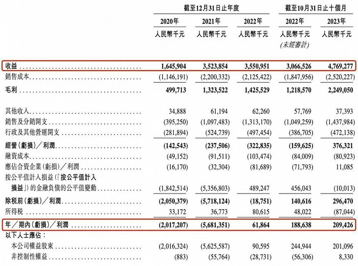 经调整净亏损分别为4.12亿元和截至2023年10月31日止十个月的同比“扭亏为盈”,净利润2.30亿人民币。