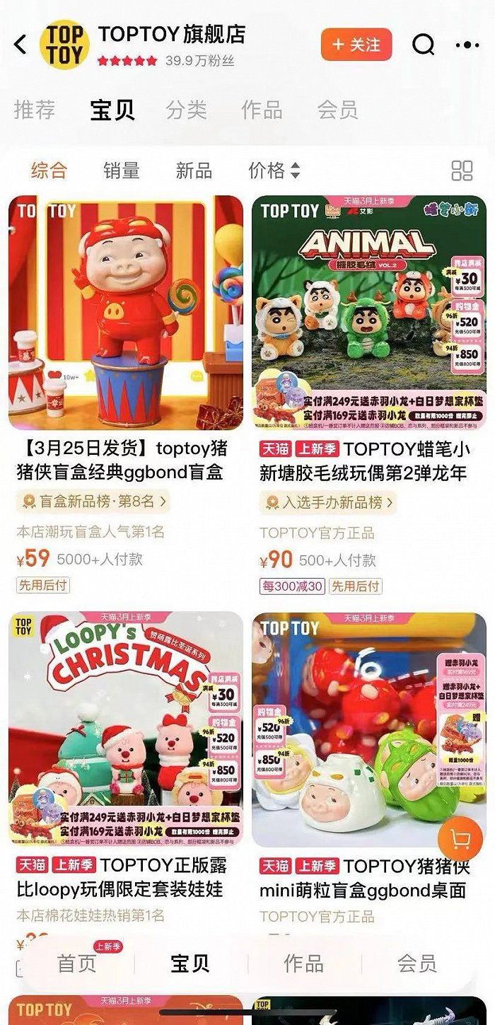 目前TOP TOY线上店铺内有猪猪侠、蜡笔小新、LOOPY、恋与制作人等一系列产品热销,还有产品成功跻身盲盒和手办新品榜。告别2023,2024年TOP TOY依旧在和IP进行非常频繁的合作,动作和上新不断。