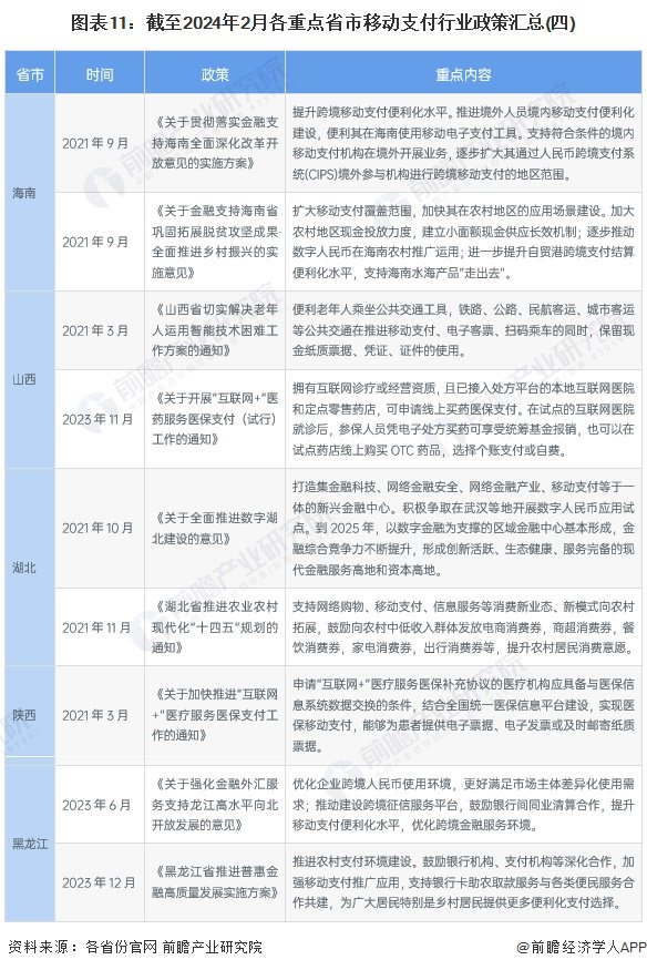 地方政府层面,为了响应国家号召,各省市积极印发有关政策通知推动移动支付行业的发展。截至2024年2月,各重点省市移动支付行业的相关政策汇总如下: