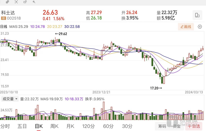 二级市场方面,科士达股价在2月5日盘中创下阶段性新低后,公司股价有所回升。截至3月13日收盘,公司股价报收26.63元,涨幅1.56%,当前总市值为156.3亿元。